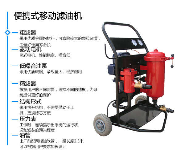 • 高壓管路設有溢流保護裝置便移式濾油機可有效保護液壓系統的安全。